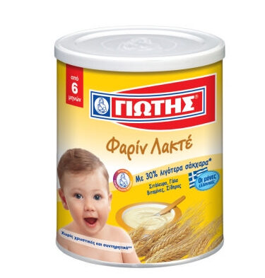 Farin Lacte von GIOTIS, hergestellt mit Weizenmehl und Milch, eignet sich ideal für Babys ab dem 6. Monat. Es ist besonders lecker und nahrhaft, perfekt für kräftige Kinder von der Krippe an!
