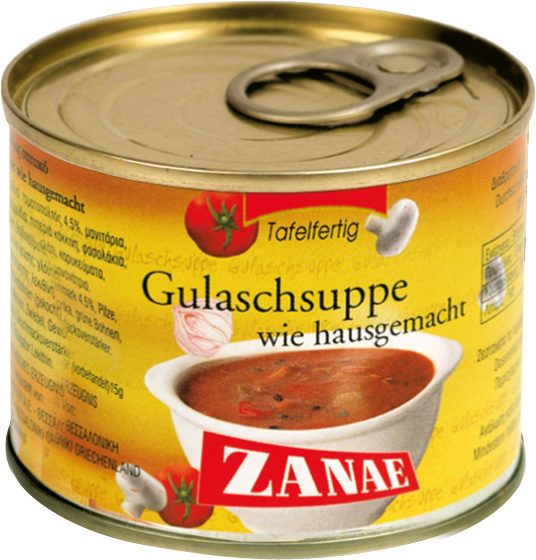 Wasser, Rindfleisch, Tomatenpüree, Pilze, modifizierte Stärke, Weizenmehl, Zwiebeln, rote Paprika, grüne Bohnen, Zucker, Rindfleischextrakt, Salz, Gewürze