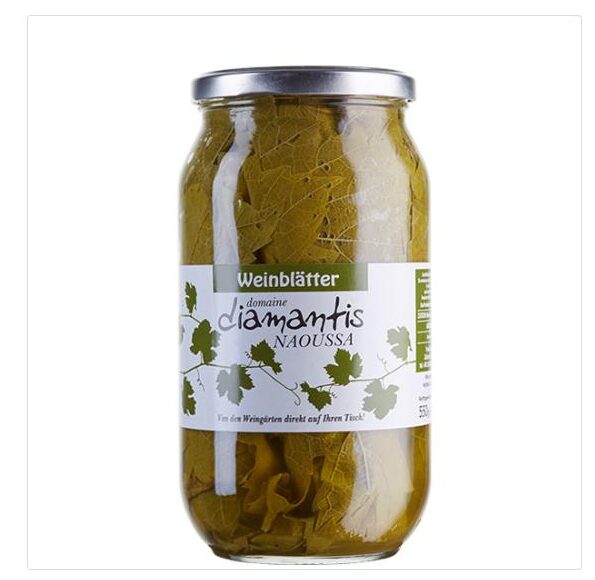 Zur Weiterverarbeitung geeignete Weinblätter von Ktima Diamantis aus Naoussa, in Salzwasser eingelegt. Die zarten Weinblätter werden im Frühjahr geerntet und am gleichen Tag der Ernte pasteurisiert, dann in Wasser eingelegt. Mit diesen Weinblättern können Sie ganz einfach köstliche Dolmadakia zubereiten. Legen Sie dazu Reis mit den gewünschten Gewürzen (z.B. Zwiebeln, Petersilie, Dill, Minze, Salz und Pfeffer) in die Mitte eines Blattes (glatte Seite nach unten!), rollen Sie es auf und formen Sie ein Päckchen. Kochen Sie die Dolmadakia dann in Wasser, Olivenöl und etwas Zitrone. Eine andere Möglichkeit ist, die Füllung mit Hackfleisch zu ergänzen.