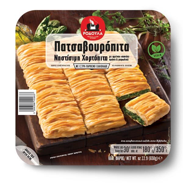 Knuspriger Blätterteig mit traditionellem Dorfteig, der mit Hingabe und Liebe zubereitet wurde, gefüllt mit frischem Spinat, Frühlingszwiebeln und Kräutern aus der griechischen Natur.